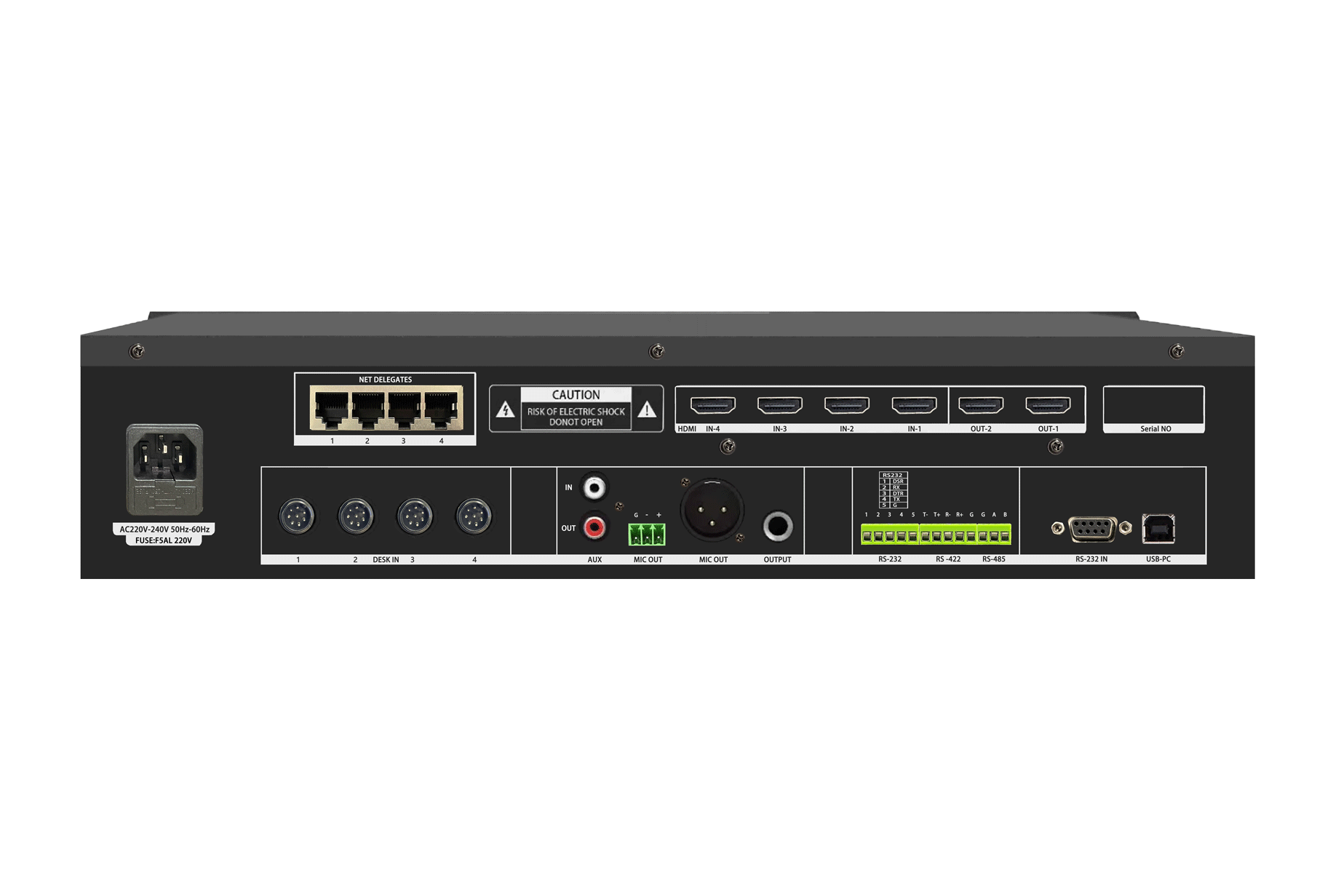 u 具有4路RJ45的會議單元接口,采用環(huán)形鏈接模式,每路支持30個單元,可接120個單元。
